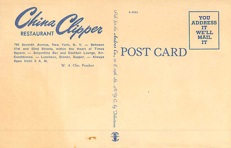 Well here is a lucky find today! I just received an original postcard of a restaurant called the China Clipper from either the late 1930s or early 1940s. According to my research, Wah Sun (Watson) Choy, a passenger on the Hawaii Clipper caring a very large some of money to his brother Frank in China, was a part owner and manager of three restaurants: The China Clipper Restaurant at 3 Doyers Street, Manhattan; The Plaza Tea Garden and another China Clipper Restaurant in Journal Square in Jersey City, NJ. I’m checking to see if this had any affiliation with Choy however the 789 7th Ave. address puts the restaurant depicted on the postcard four miles away and in midtown Manhattan.