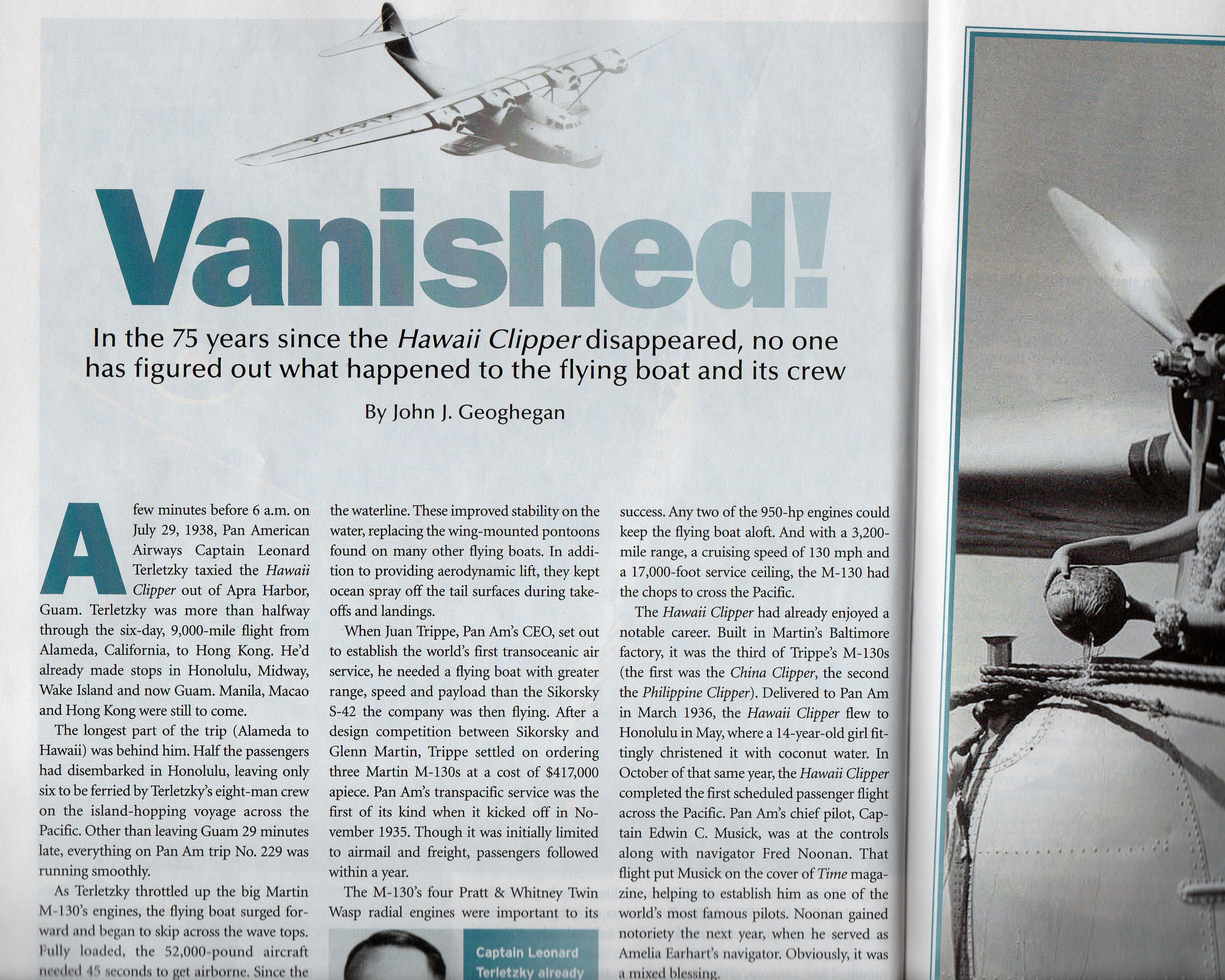 Good news! The story of the Hawaii Clipper has been carried in this months Aviation History Magazine, a must read source for aviation enthusiasts. Check out: http://www.HistoryNet.com/aviation-history for more details. This particular article entitled “Vanished” starts on page 30 and covers six pages of interviews and details covering the mysterious loss. My thanks to writer John J. Geoghegan and Roger L. Vance for reaching out to me earlier this year for information and photos.