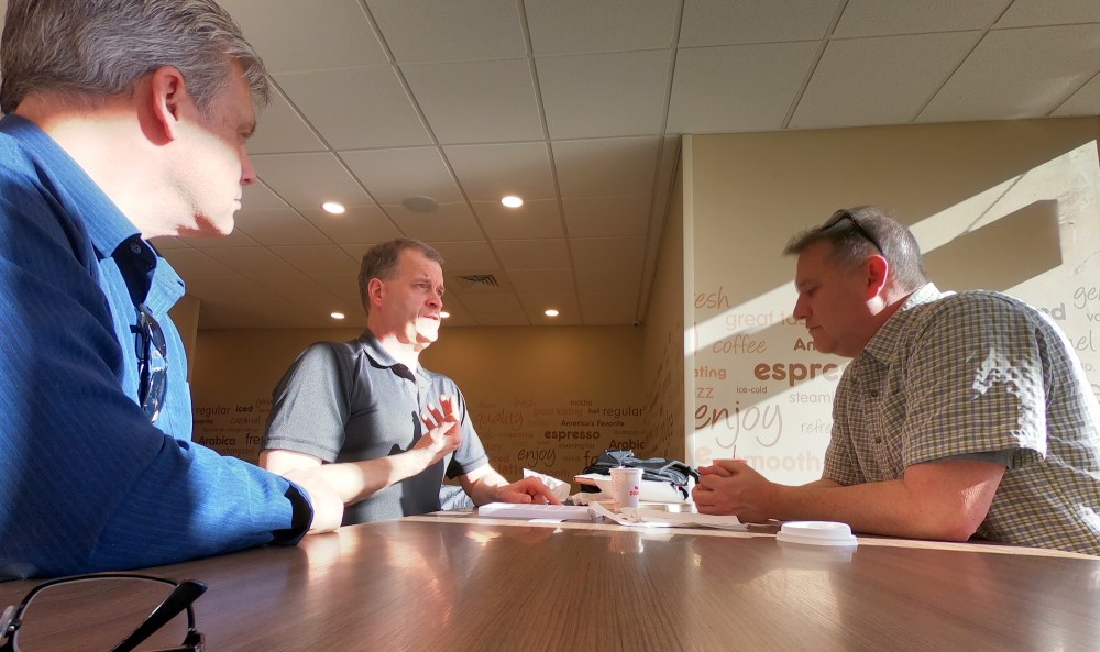 Jim (Center) discussing ideas with Jeff (L) and Guy (R).