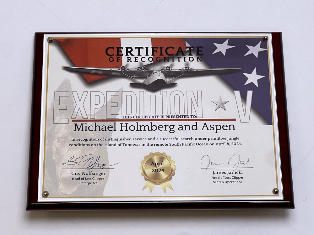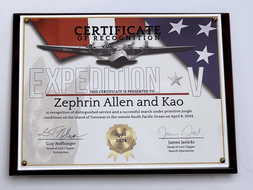 The entire Lost Clipper team would like to thank Zephrin Allen and Mike Holmberg as well as their search dogs, Kao and Aspen, for going above and beyond during our recent Expedition V. They were recently presented these plaques (below) to thank them for finding a number of “hits” on location and samples that we retrieved for forensic studies.